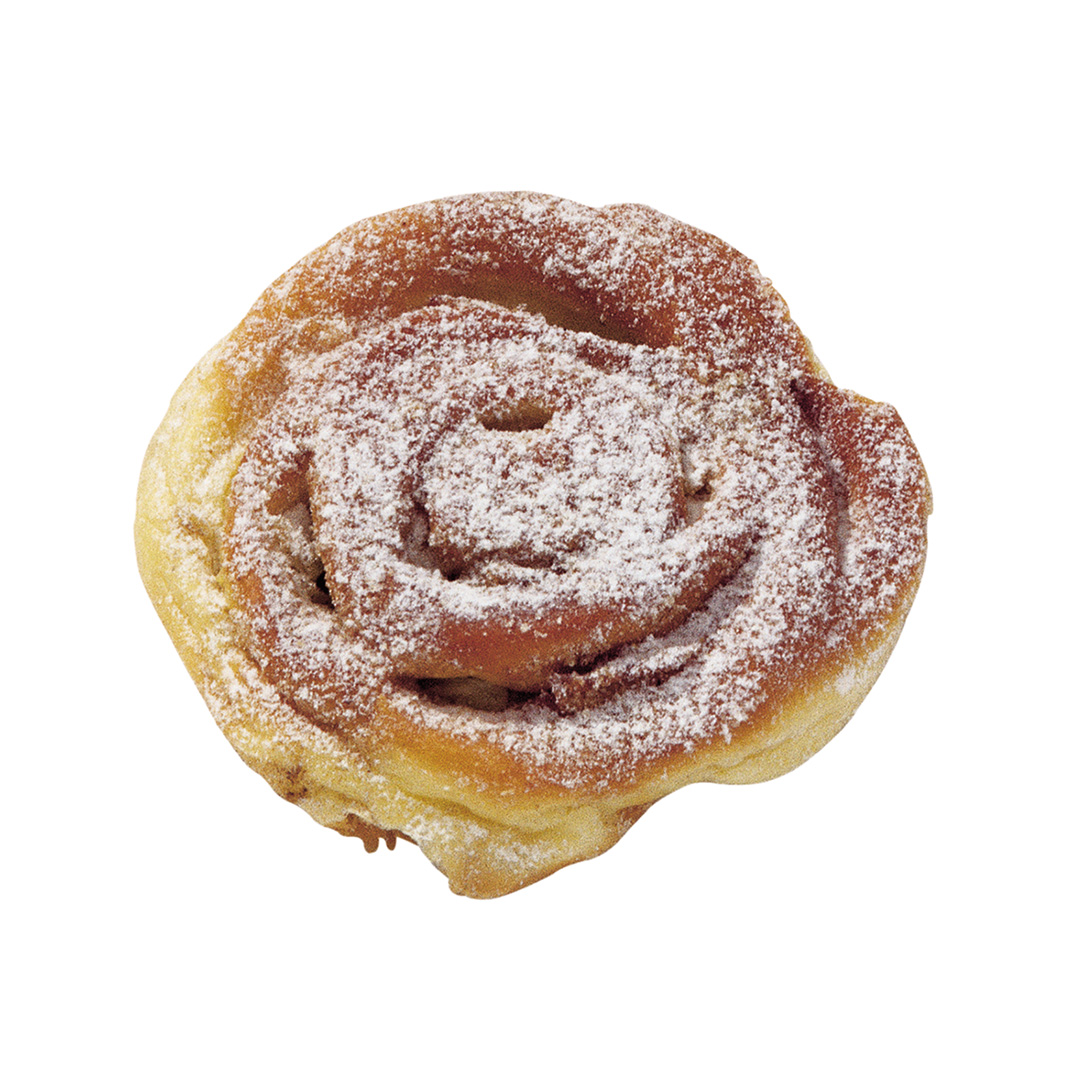 Locker gewickeltes, goldbraun gebackenes, mit Apfelstücken und Apfelfüllung gefülltes Siedegebäck, gezuckert.