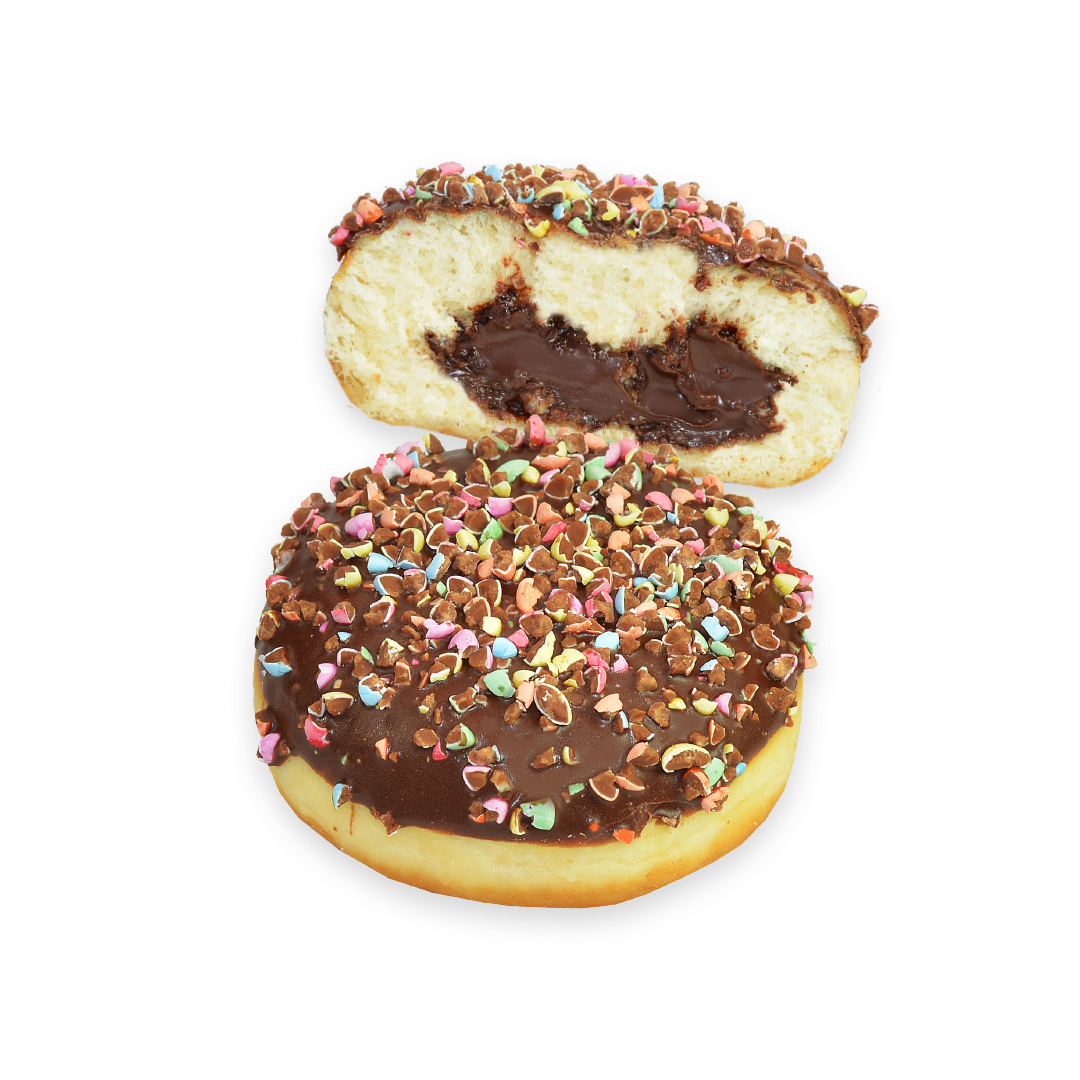 Siedegebäck mit Kakaocremefüllung und Kakaohaltiger Fettglasur; dekoriert mit zerkleinerten Schokolinsen mit Schokoüberzug.