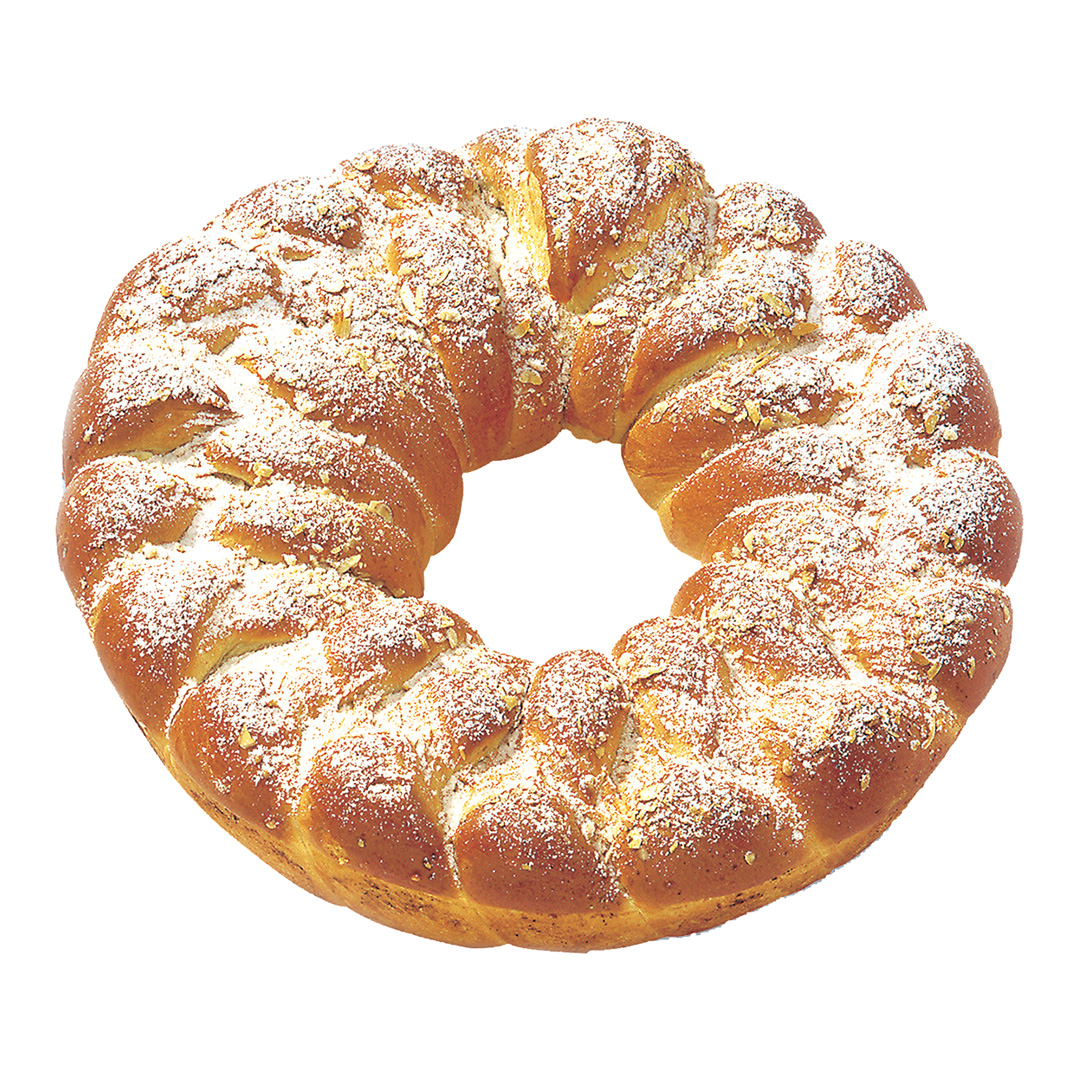 Saftiger Hefefeinteig in Kranzform mit Hagelzucker und gestiftete Mandeln bestreut, fertig gebacken.