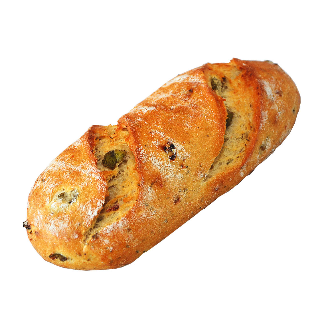 Mediterranes Steinofenbaguette mit zwei schrägen Dekorschnitten in ovaler Form. Die Oberfläche ist rustikal und leicht bemehlt. Das Produkt ist aus Weizenteig und teilgebacken mit Anteilen von Tomaten, Olive und Basilikum im Teig.