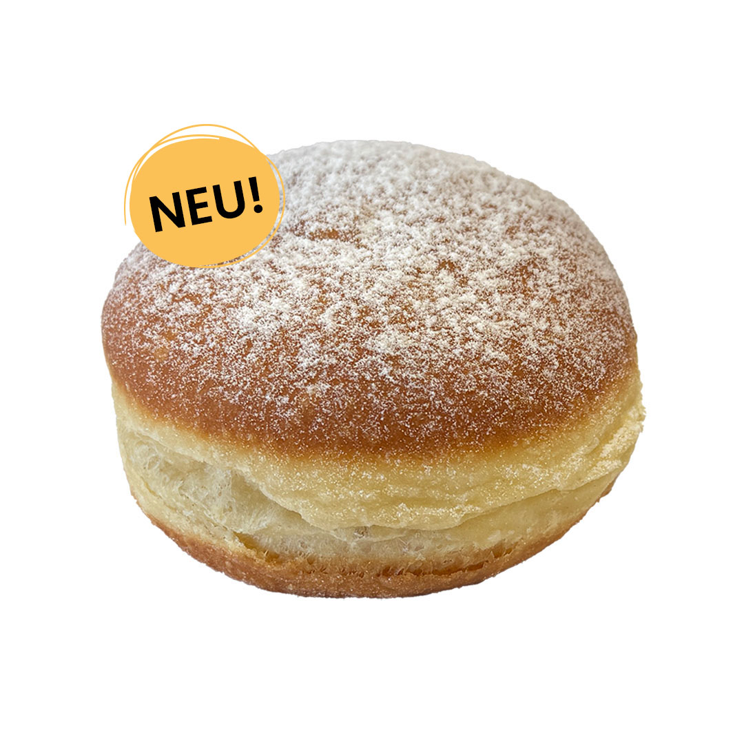 Der Berliner ist aus einem lockeren Hefeteig. Er ist fertig gebacken, gefüllt mit einer leckeren Mehrfruchtkonfitüre und ohne Dekor.